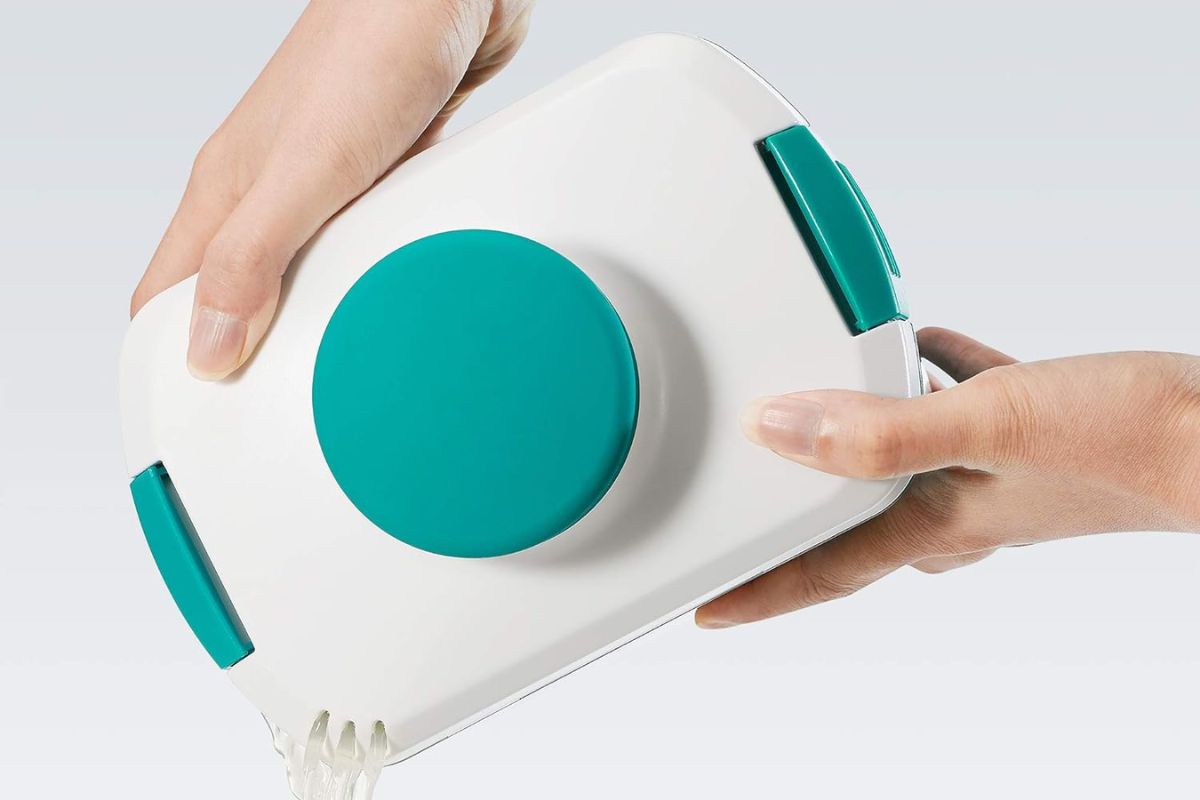 The container includes markings so you can see exactly how much water you’ve removed, and the top doubles as a pour-spout for easy draining. The removable tofu plate can double as a cutting board.