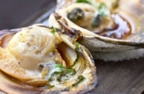 - When the grill is hot, place the clams on it. When the clams are fully opened, after about 5 minutes, pour the Seasonings and put green onion and butter on the clams, and cook until boiling. Carefully remove them from the grill. Try not to spill their juices.