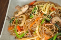 Japchae (잡채 – or chapchae) is a classic Korean stir-fried noodle dish seasoned with a sweet and savory sauce. The name japchae describes a mix of finely cut ingredients—vegetables, egg, mushroom, and meat—that are included in the noodles.