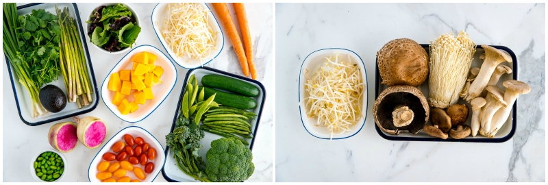 - Veggies/Mushrooms: Rinse and cut the vegetables of your choice to the appropriate size. Clean and cut the mushrooms. I use a julienne peeler to save time julienning carrots and peeling cucumbers.