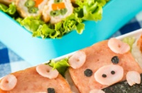You might wonder how the piggy’s ears and nose stay where they belong when the kids open their lunch box. We use uncooked spaghetti to secure them onto the spam. The rice contains enough moisture so by lunchtime, the spaghetti is soft and edible!