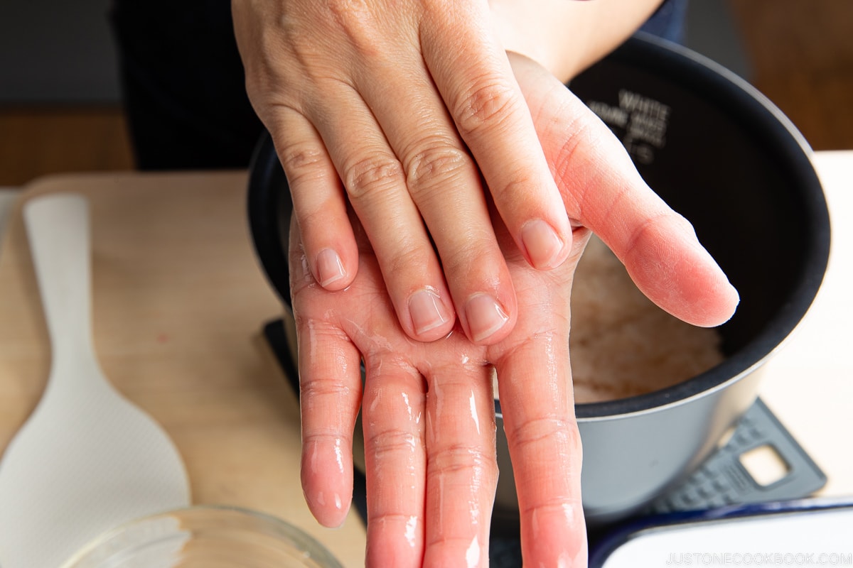 I used to use just water for this process, but I found the sugar-water syrup makes it easier and keeps the food safe. This syrupy water is called temizu (手水)—literally “hand water” in Japanese—and it’s typically made with one part of sugar and one part of water. I use a 1:5 ratio, by weight: 1 Tbsp of sugar (12 g) and 4 Tbsp of water (60 g).
