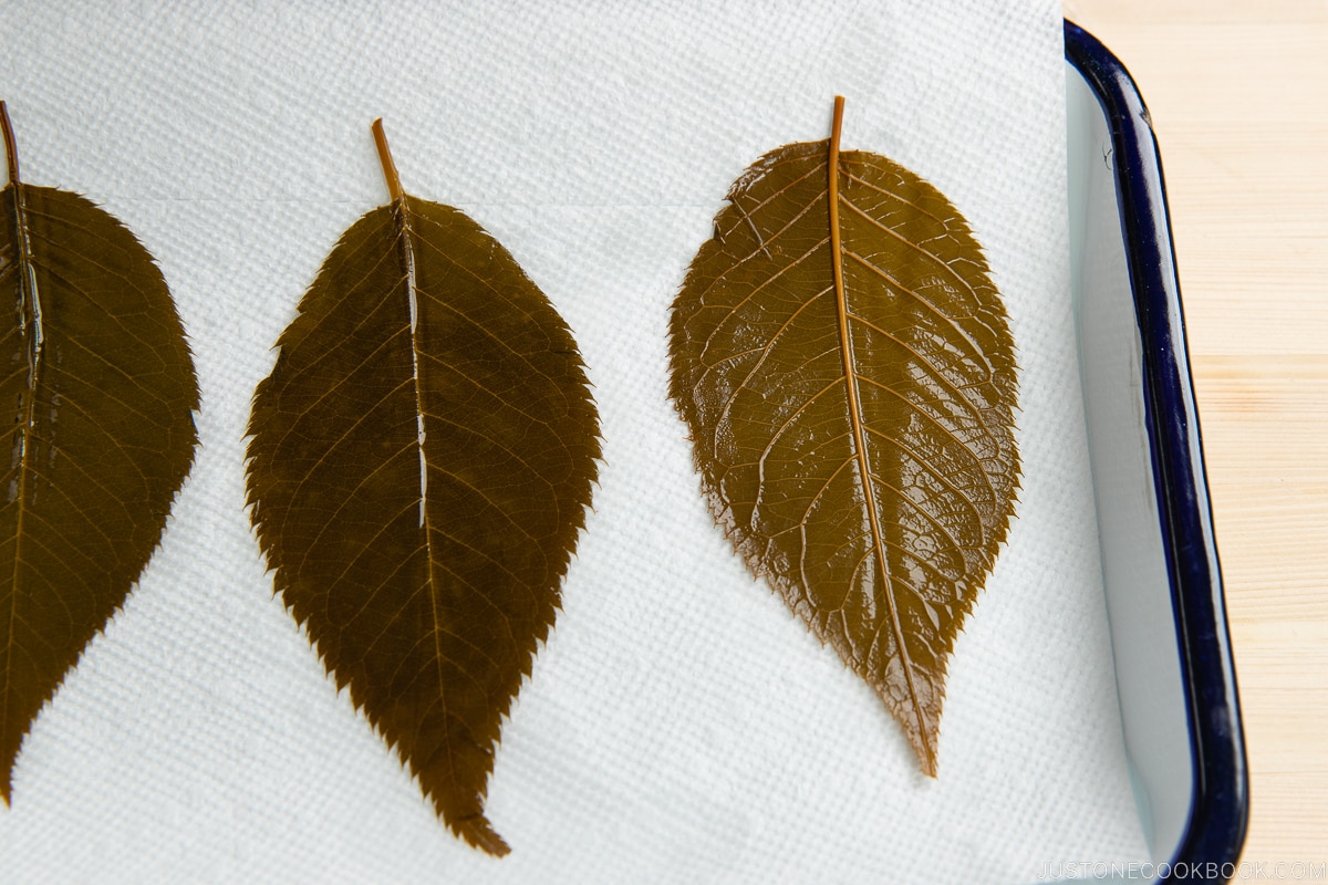 • Blot the leaves dry with a paper towel. Tip: Do not dry them too much. While you‘re working on the sakura mochi, the leaves will continue to dry and you don‘t want them to be too dry in the end.
